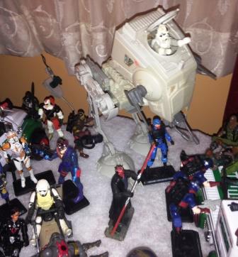 Cobra Commander naturally demanded domination of Cobra itself as his first priority. The Crimson Guardsman are handing the humbled Serpentor off to a member of the Fighting 501st—Vader’s Fist, to be taken in the Dark Lord’s personal shuttle for transport. A horrible fate awaits him in the Empire’s medical labs where he will be experimented on in order to enhance their cloning program.  (Wow, went a little dark this year...I blame Jessica Jones.)  Darth Vader will be remaining in his shuttle instead of striding majestically across the frozen wasteland because I was too cheap to buy a fancy replacement one from the new toy lines.  The figure I"ve had from when I was a kid, assuming he has all his limbs (which is questionable,) definitely can’t stand, is missing a lightsaber, and has the propensity for his head to drop off if unsupported.