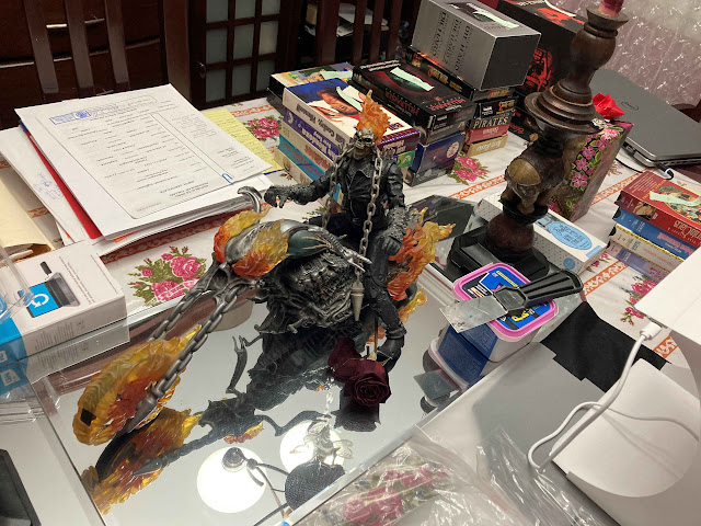 An example of where we are today: The release of the same size Danny Ketch Ghost Rider with motorcycle was just announced by Hasbro. He has far less articulation (with two alternate hands instead of poseable ones) a slightly less impressive sculpt, no comic book and a cost over SEVEN TIMES what I paid for my figure. My Mother-In-Law didn't have to pay that much when she bought me the over sized version (2007) that we use as a dining room centerpiece.